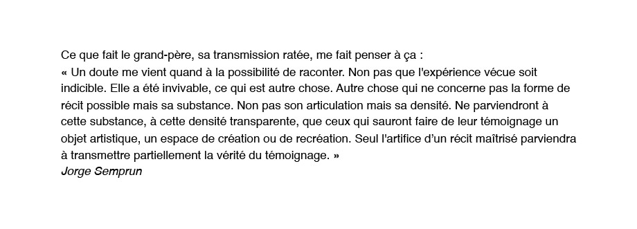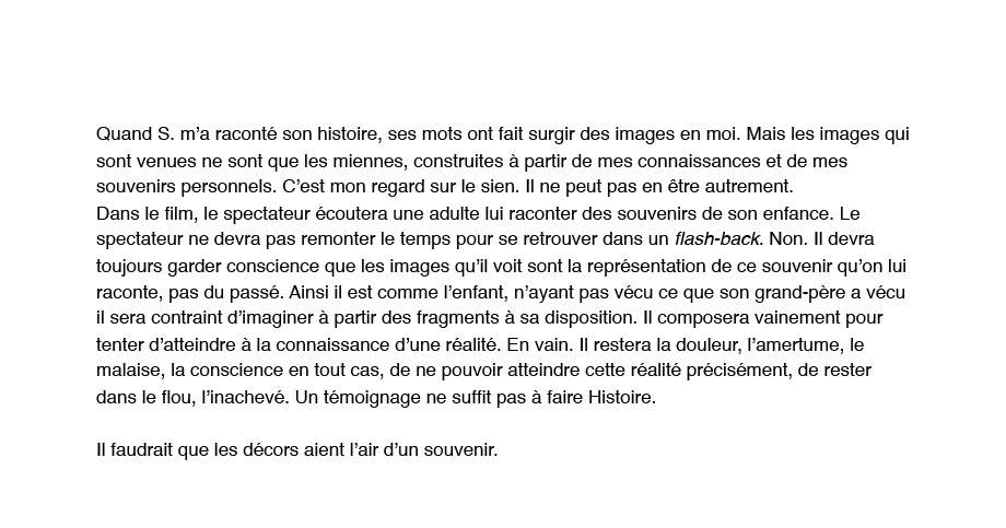 « Je n’oserais jamais raconter ça à ma mère. Me plaindre alors que ce qu’elle a vécu est tellement fort. Ma douleur est ridicule si je la compare à ce qu’elle a vécu, elle. Je n’ai pas le droit de me plaindre et j’en ai marre. C'est pourquoi ce serait mieux dans un film. Une fiction, pas un documentaire. Ce que je voudrais c’est que tout soit exactement comme dans mon souvenir mais que personne ne puisse croire à cette histoire. Alors en plus si ce n’est pas un juif qui raconte ça, personne n’y croira et surtout par ma mère. Elle pensera que j’ai voulu faire l'intéressante comme d’habitude… Et puis un non-juif ne comprend pas vraiment ce que je dis. Aussi ce sera faux, ce sera décalé, ce sera ce qu’il me faut ».