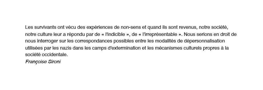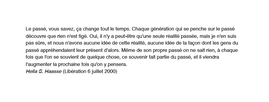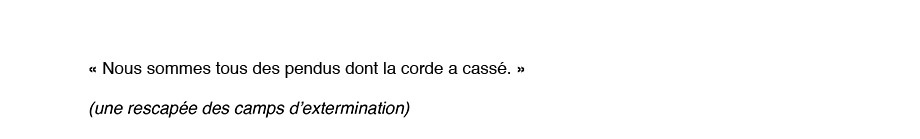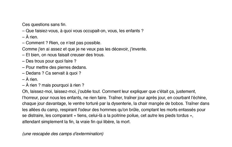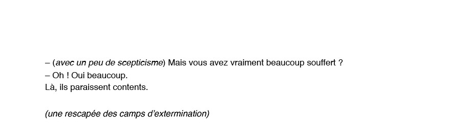 « Je n’oserais jamais raconter ça à ma mère. Me plaindre alors que ce qu’elle a vécu est tellement fort. Ma douleur est ridicule si je la compare à ce qu’elle a vécu, elle. Je n’ai pas le droit de me plaindre et j’en ai marre. C'est pourquoi ce serait mieux dans un film. Une fiction, pas un documentaire. Ce que je voudrais c’est que tout soit exactement comme dans mon souvenir mais que personne ne puisse croire à cette histoire. Alors en plus si ce n’est pas un juif qui raconte ça, personne n’y croira et surtout par ma mère. Elle pensera que j’ai voulu faire l'intéressante comme d’habitude… Et puis un non-juif ne comprend pas vraiment ce que je dis. Aussi ce sera faux, ce sera décalé, ce sera ce qu’il me faut ».